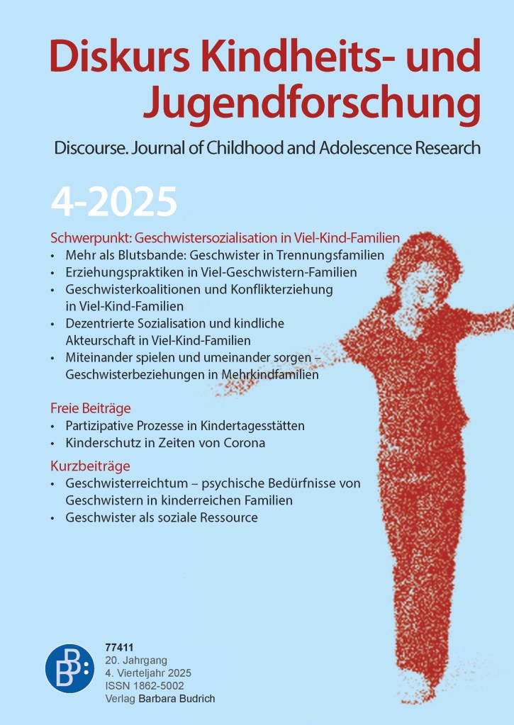 Das von mir gemeinsam mit Jürgen Budde und Rebecca Schmolke verantwortete Schwerpunktheft „Geschwistersozialisation in Viel-Kind-Familien“ der Zeitschrift Diskurs Kindheits- und Jugendforschung wurde veröffentlicht. Es enthält auch einen Beitrag von mir zum Thema „Geschwisterkoalitionen und Konflikterziehung in Viel-Kind-Familien“: